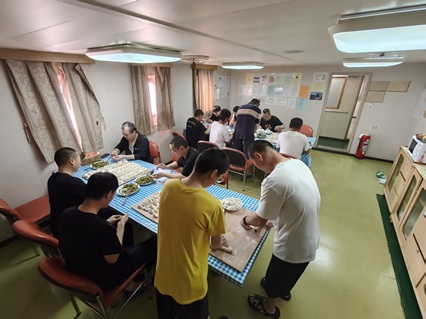 虽然不能回家,但船上的年味儿一点也不淡。除了值班的同事,大家一起动手,把狭小的船舱布置得温馨热闹。我笨拙地跟着老船员贴春联,把“福”字贴倒了好几次,引来一阵善意的笑声;大厨用有限的食材,做出了带着家乡味道的红烧肉和饺子,热气腾腾的饭菜端上桌时,来自五湖四海的船员围坐在一起,没有觥筹交错的应酬,只有真诚朴实的问候。有人给我夹了一个饺子,笑着说:“尝尝,这是我们船上的‘团圆味’。”那一刻,我鼻子一酸,原来没有亲人在身旁,也能感受到家的温暖。