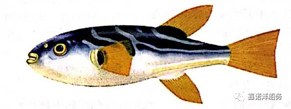 条纹东方鲀体形似暗色东方鲀,上下颔各有齿2枚,体背及腹面均被密生小刺,体上半部具有蓝白两色相间的波状条纹,背鳍及胸鳍基部各有一蓝黑色斑块,腹面白色,上下唇、鼻囊及各鳍绍均呈艳黄色,背鳍、臀鳍几相对。无腹鳍,尾鳍截形或稍内凹。分布于沿海及江河口。肉鲜美,富脂肪,蛋白质含量很高。但其肝脏、生殖腺和血液有剧毒,食用时应特别慎重,一般应腌制后食用较安全。