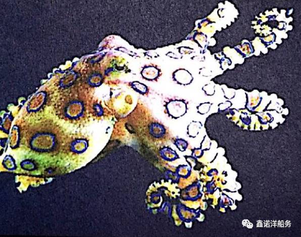蓝色圆环章鱼体形较小,生活在澳大利亚以东的海域,尤其是大堡礁海域,体色淡灰白色,缀有彩虹色圆环标记,有剧毒,受践踏或者触摸时,可发出致命一击。所以,对所有热带礁石附近的章鱼都要极其小心。