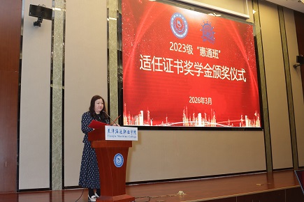 仪式在热烈的掌声中拉开帷幕,颁奖仪式由天津惠通公司副总经理、“惠通班”负责人王莹主持。本次共有5名“惠通班”学生凭借优异成绩一次性通过甲类适任证书考试,获得公司专项奖学金。他们用扎实的专业功底和勤奋的学习态度,为自己的航海职业生涯交出了第一份亮眼答卷。
